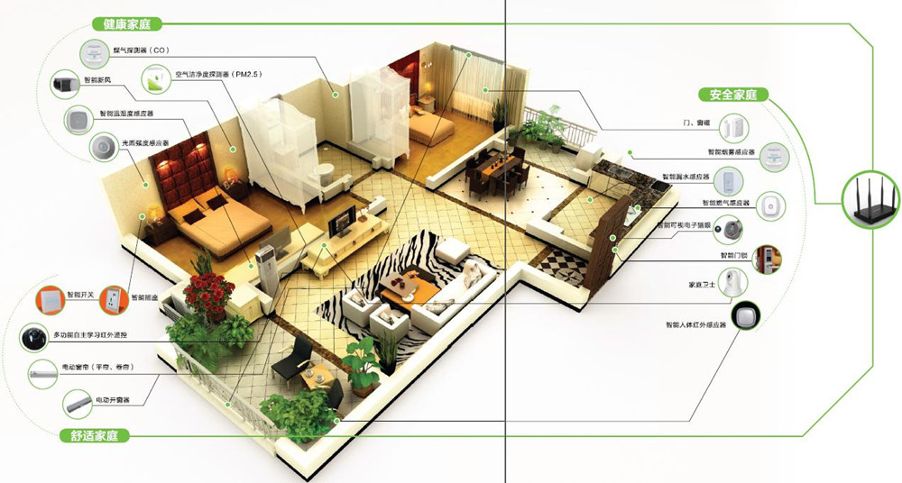 ●Intelligent environment control system which can adjust home temperature and humidity, monitor outdoor PM2.5 and indoor light,so as to ensure that you have a comfortable home environment;