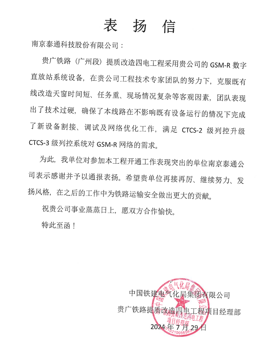 近日,泰通科技收到中國鐵建電氣化局集團(tuán)有限公司發(fā)來的表揚(yáng)信。信中對公司在貴廣鐵路(廣州段)提質(zhì)改造四電工程中出色的專業(yè)能力和高效的團(tuán)隊協(xié)作表達(dá)了感謝,同時希望泰通科技再接再厲,在之后的工作中為鐵路運(yùn)輸安全做出更大貢獻(xiàn)。
