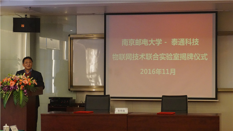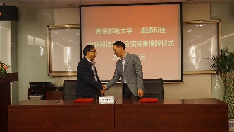 揭牌儀式上泰通科技總工程師陳建平與南京郵電大學(xué)通信技術(shù)研究所副所長楊龍祥進(jìn)行了現(xiàn)場簽約,朱校長和吉總共同為“物聯(lián)網(wǎng)聯(lián)合實(shí)驗(yàn)室”揭牌。