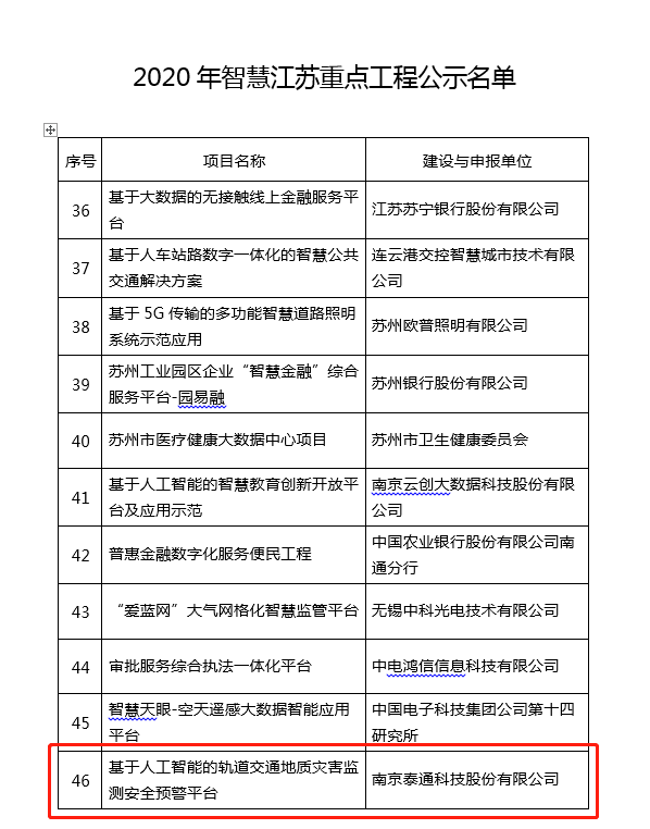 喜訊丨泰通科技《基于人工智能的軌道交通地質(zhì)災(zāi)害監(jiān)測安全預(yù)警平臺項目》上榜2020年智慧江蘇重點工程