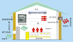 工作原理:智能新風(fēng)系統(tǒng)通過(guò)引入室外冷空氣,對(duì)機(jī)房溫度進(jìn)行調(diào)節(jié),當(dāng)室內(nèi)溫度達(dá)到22℃(可設(shè)置),室內(nèi)外溫度差△T≥2℃,智能新風(fēng)啟動(dòng),向室內(nèi)送入過(guò)濾后的冷空氣,室內(nèi)溫度降至18℃(可設(shè)置)時(shí),智能新風(fēng)停機(jī),以此循環(huán)工作。